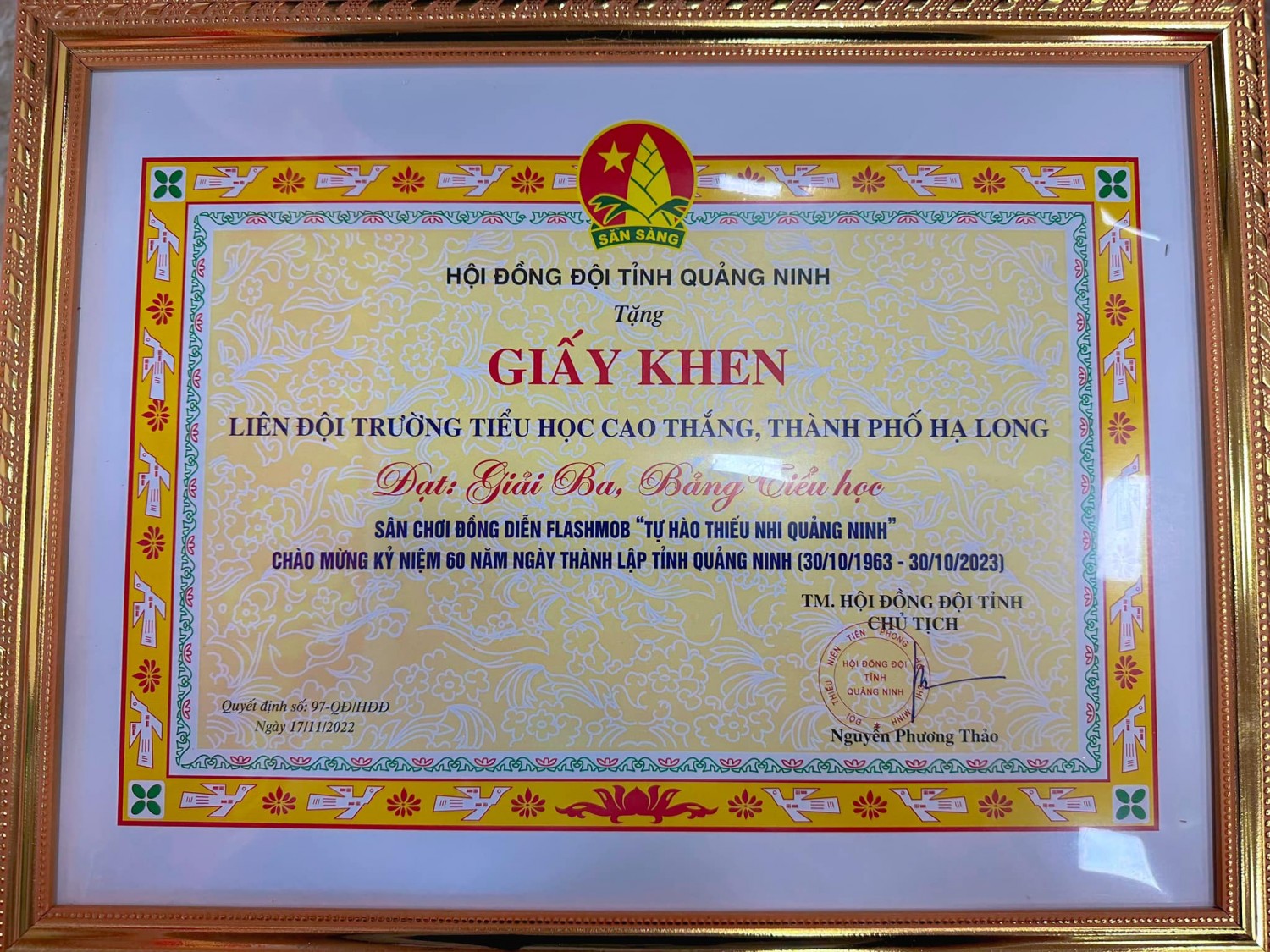 ?Liên đội Tiểu học Cao Thắng đã xuất sắc đạt giải ba cấp Tỉnh, vinh dự là 1 trong 2 đơn vị thành phố Hạ Long đạt giải cao trong cuộc thi Sân chơi đồng diễn Flashmob “ ở bảng Tiểu học.