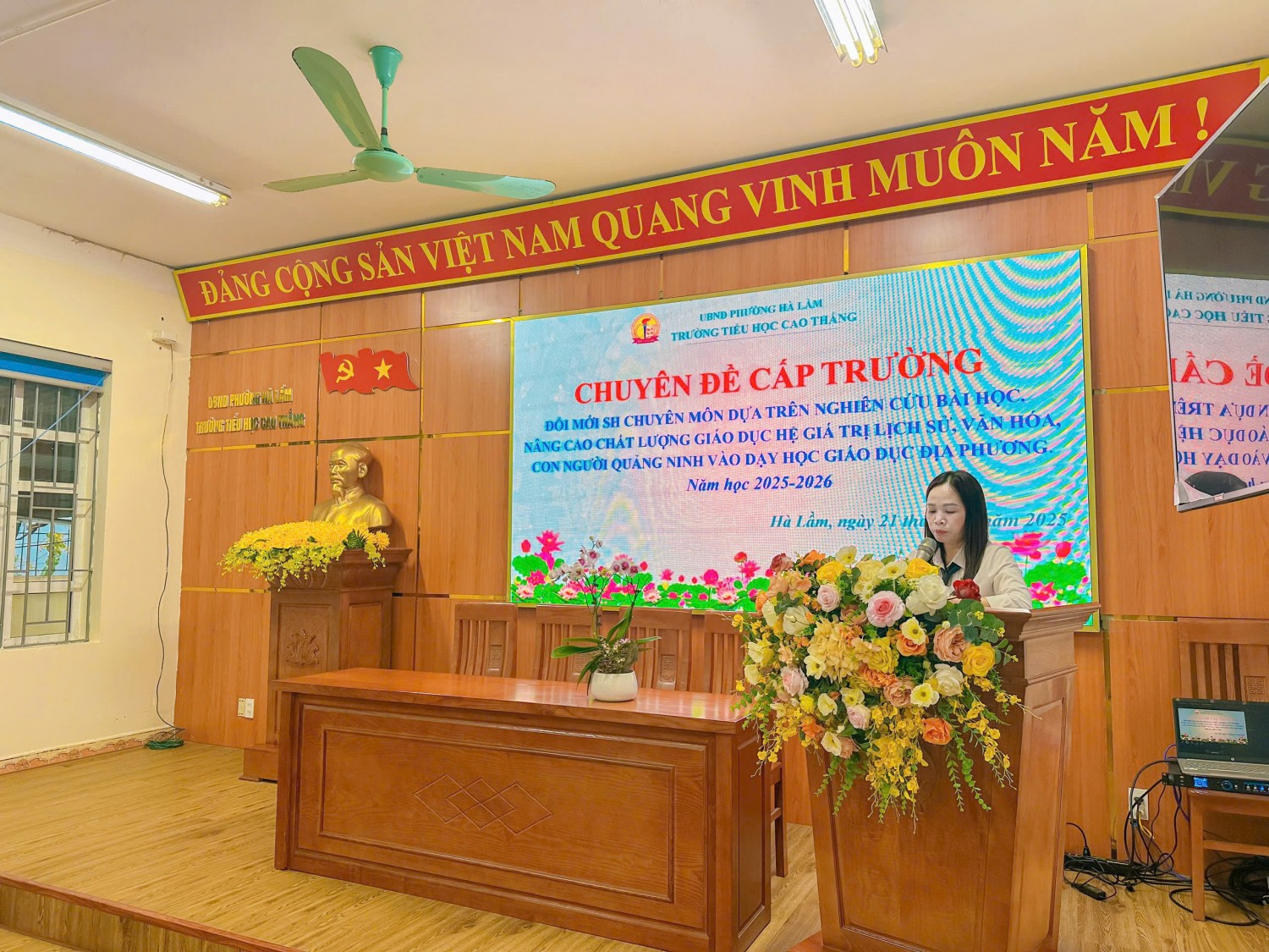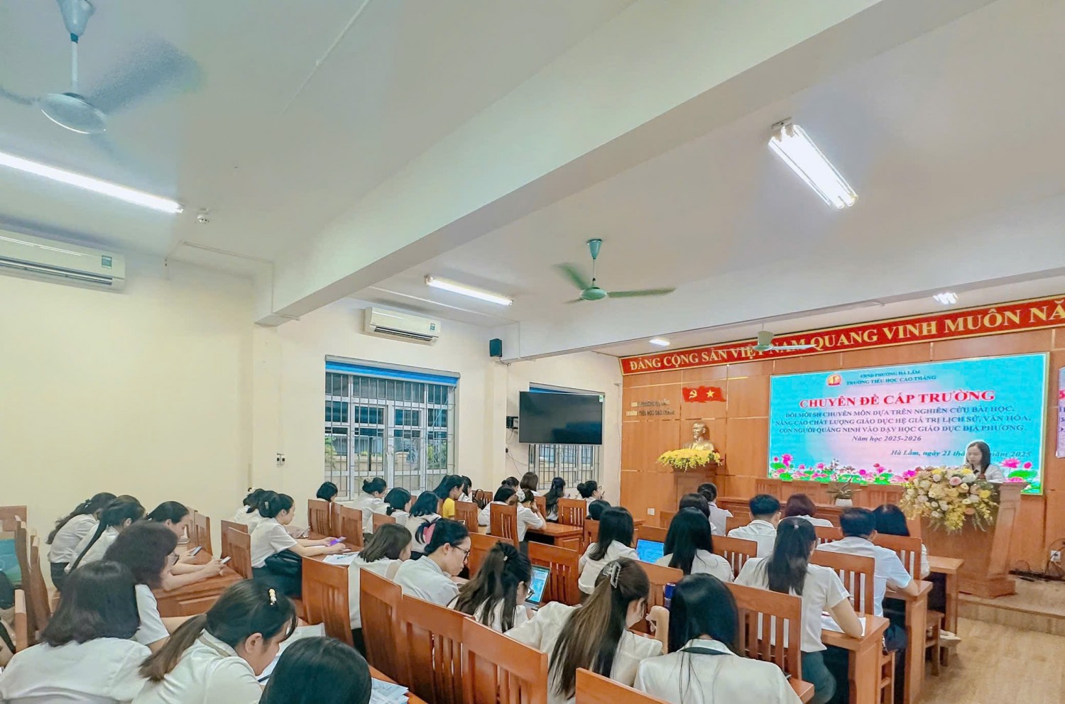 🌟TRƯỜNG TIỂU HỌC CAO THẮNG TỔ CHỨC CHUYÊN ĐỀ NÂNG CAO CHẤT LƯỢNG GIÁO DỤC HỆ GIÁ TRỊ LỊCH SỬ, VĂN HÓA, CON NGƯỜI QUẢNG NINH QUA GIÁO DỤC ĐỊA PHƯƠNG 🌟 Thực hiện Kế hoạch số 285/KH-THCT ngày 21/8/2025 về thực hiện nhiệm vụ năm học 2025-2026 và Kế hoạch số 316/KH-THCT ngày 11/9/2025 của Trường Tiểu học Cao Thắng về Kế hoạch thực hiện Chuyên đề năm học 2025-2026, Ngày 17/10/2025, tổ chuyên môn 4-5 trường Tiểu học Cao Thắng đã tổ chức thành công chuyên đề “Nâng cao chất lượng giáo dục Hệ giá trị lịch sử, văn hóa, con người Quảng Ninh qua dạy học Giáo dục địa phương”. Phát huy sự chủ động, sáng tạo của học sinh thông qua ứng dụng công nghệ AI trong dạy học Hoạt động trải nghiệm lớp 4. Đây là hoạt động thiết thực nhằm thực hiện nhiệm vụ năm học 2025–2026, đồng thời khẳng định bước tiến mới trong đổi mới phương pháp dạy học, phù hợp với xu thế chuyển đổi số trong giáo dục hiện nay. Trong tiết chuyên đề, cô giáo Nguyễn Mai Anh đã chia sẻ nhiều giải pháp cụ thể, dễ áp dụng trong việc tích hợp trí tuệ nhân tạo (AI) vào dạy học môn Hoạt động trải nghiệm lớp 4, bao gồm: • Sử dụng ChatGPT để xây dựng hệ thống bài học, câu hỏi tương tá