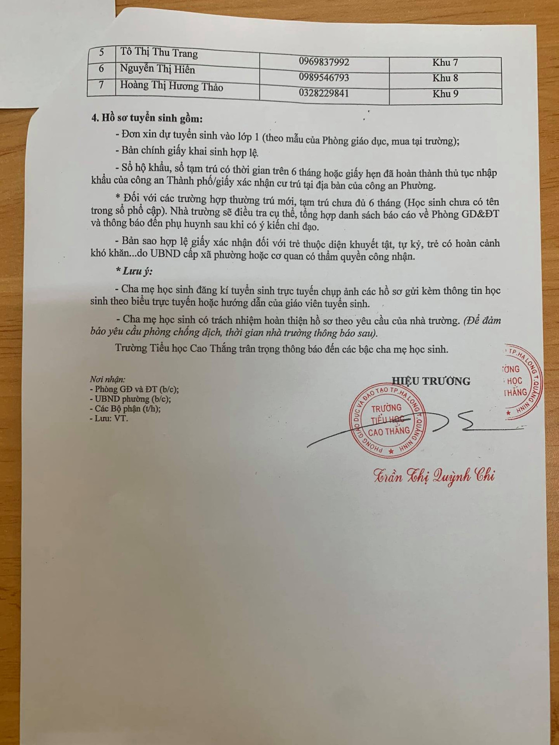 - Tuyển sinh qua Điện thoại: Phụ huynh gọi điện thoại đến giáo viên tuyển sinh của khu mình cư trú. (danh sách giáo viên kèm theo thông báo).