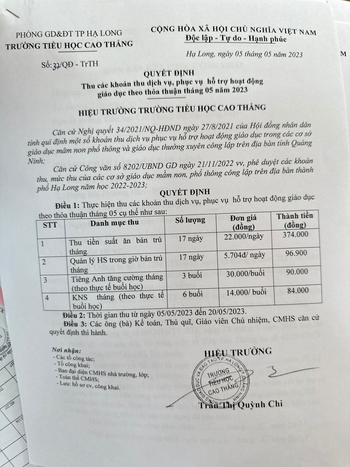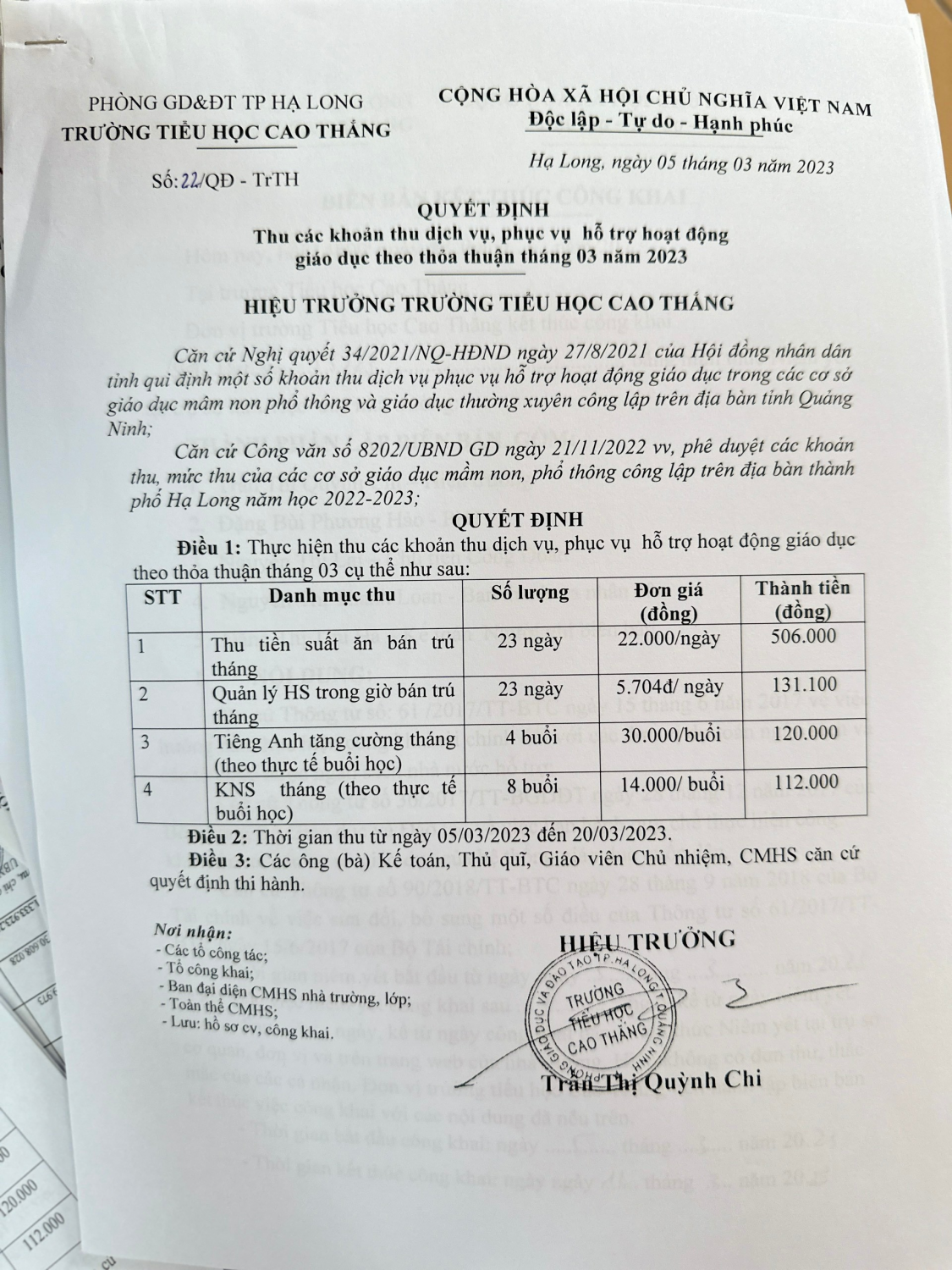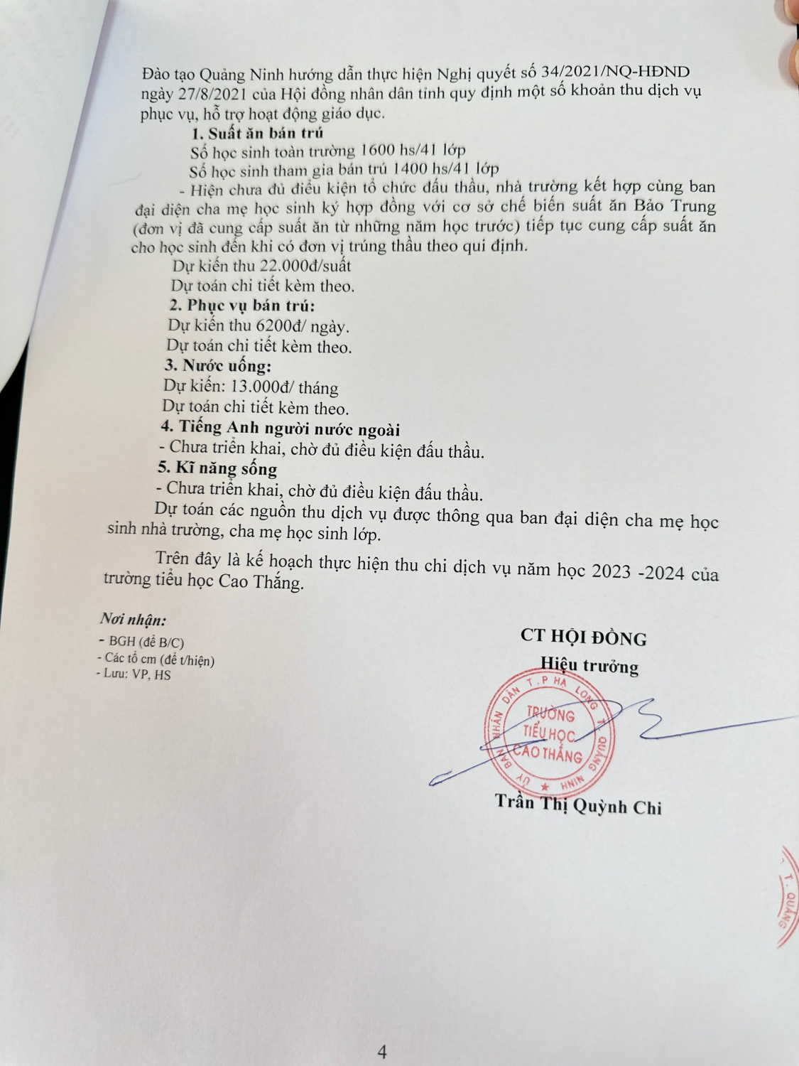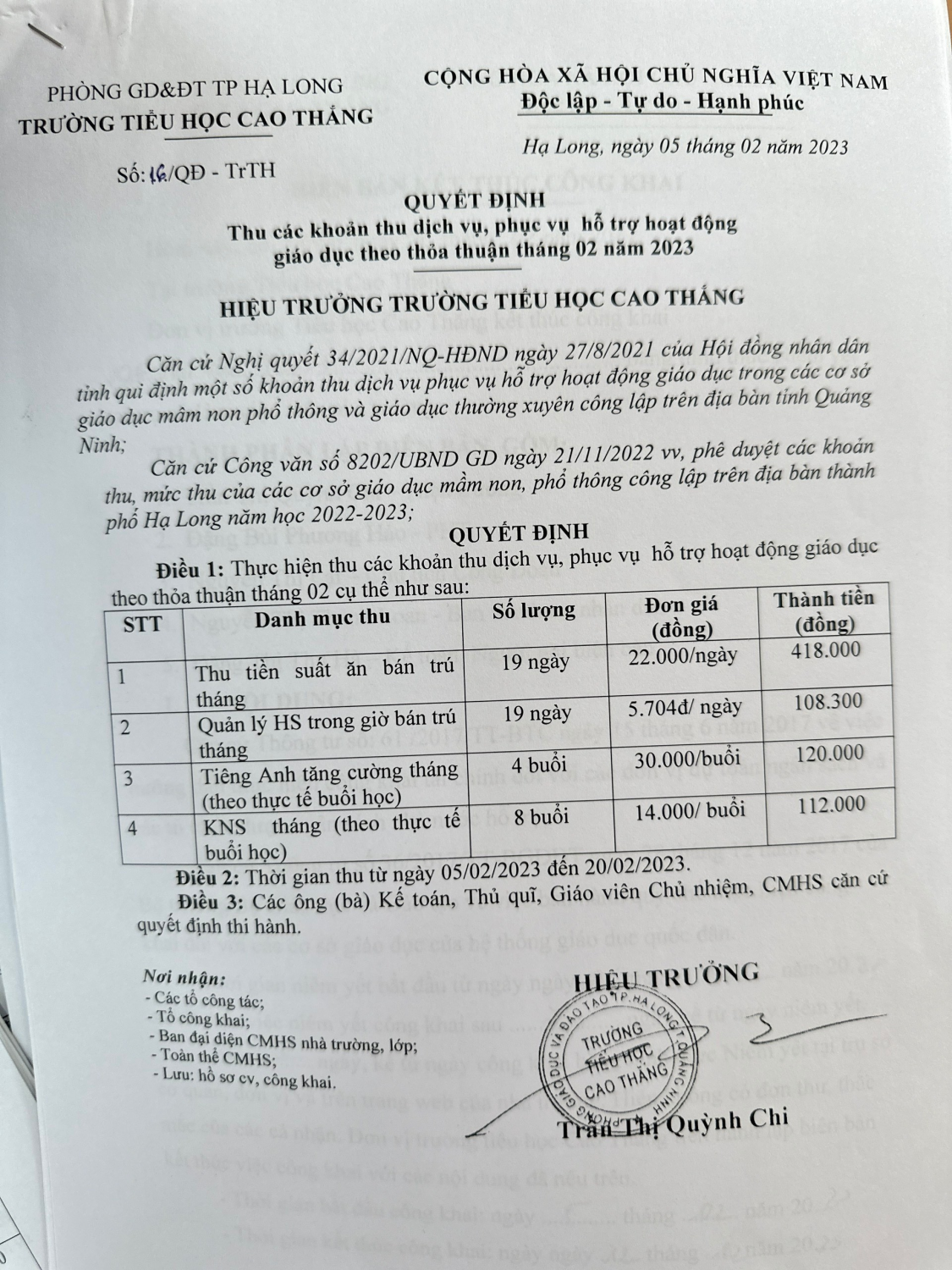 Công khai dịch vụ năm học 2023-2024