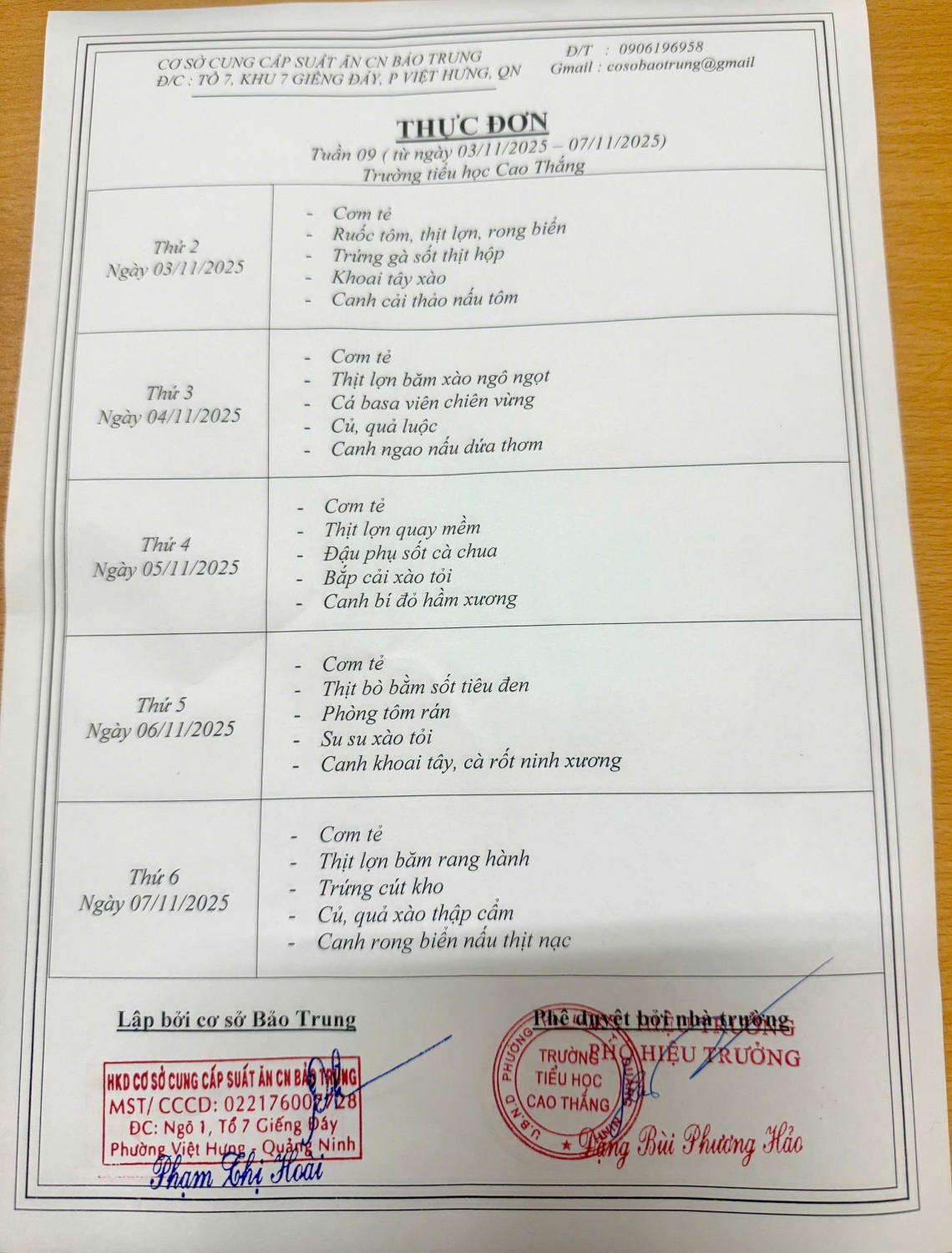 Thực đơn bán trú tuần 9